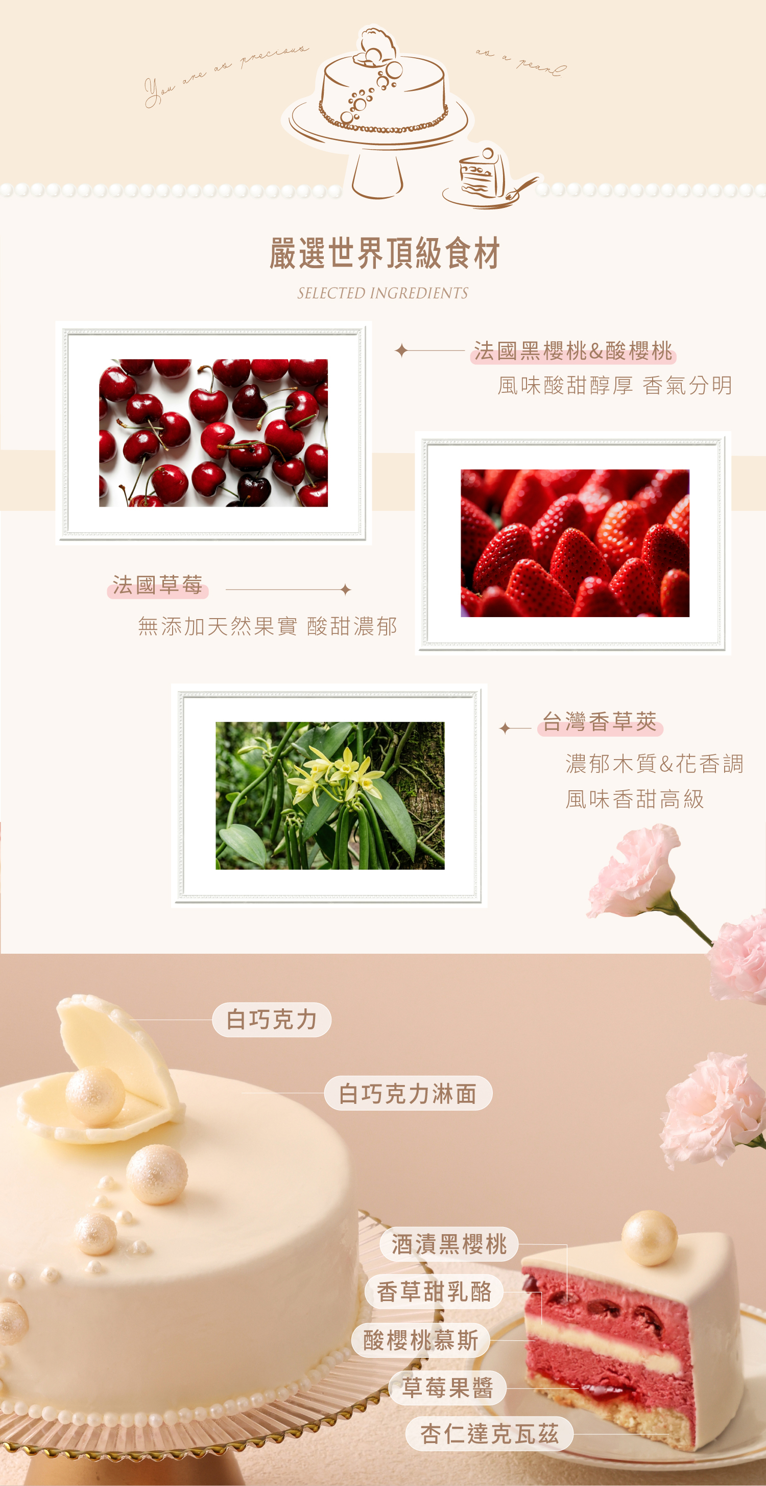 《 嚴選食材 》法國奶油、台灣無施打抗生素雞蛋、美國杏仁粉、台灣香草莢、法國櫻桃