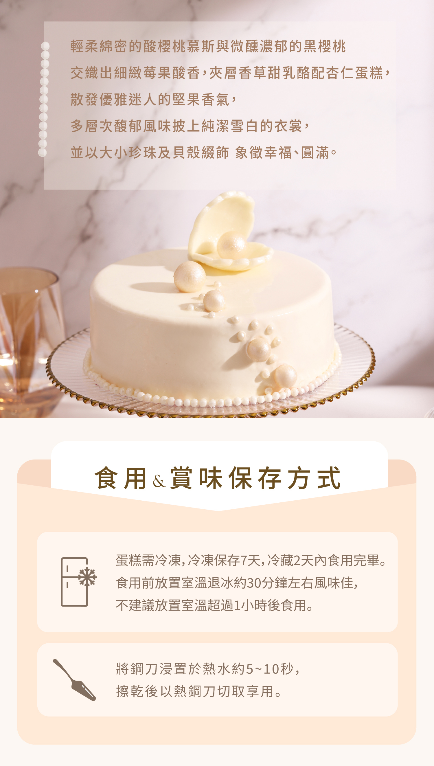 輕柔綿密的酸櫻桃慕斯與微醺濃郁的黑櫻桃交織出細緻莓果酸香,夾層香草甜乳酪配杏仁蛋糕,散發優雅迷人的堅果香氣,多層次馥郁風味披上純潔雪白的衣裳,並以圓珠及貝殼綴飾象徵幸福、圓滿。